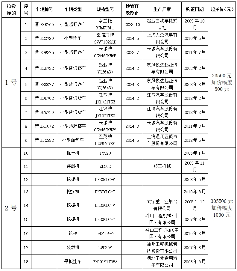 1號(hào)標(biāo)的:小型越野客、貨車、轎車等9輛(明細(xì)附后)